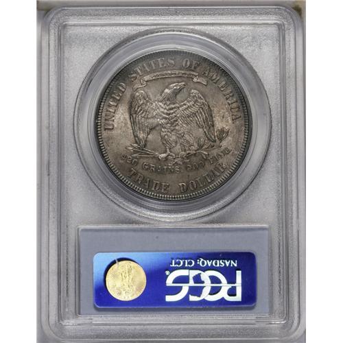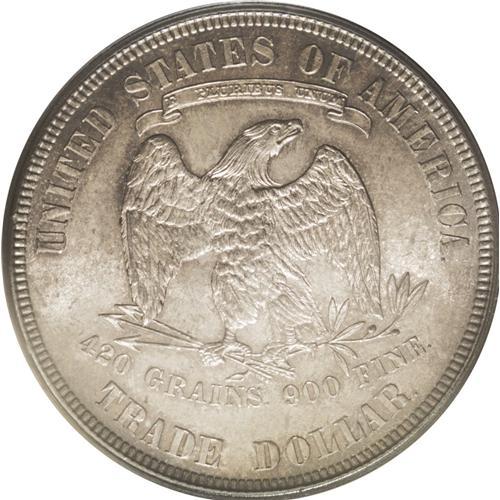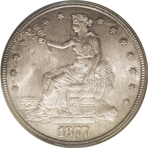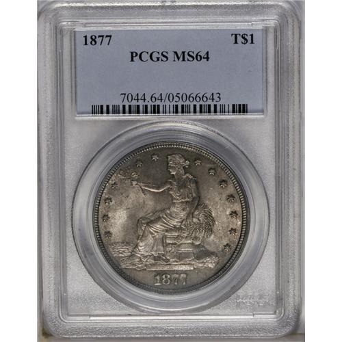 <B>1877<T$1> MS64 PCGS.</B></I> Satiny luster throughout and exhibiting a layer of steel-gray toning. The strike slightly soft at the obverse periphery, with most of the stars lacking their central lines. the important central devices are sharp, including the feathers on the eagle. A very difficult coin to locate with so few signs of handling, and this one should suit most date collectors who demand lofty grades. Population: 59 in 64, 2 finer (6/06).