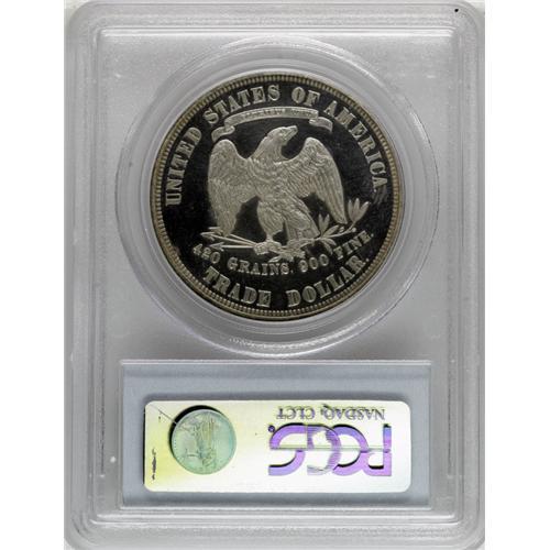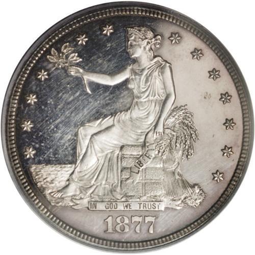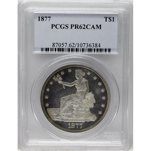 <B>1877 T$1 PR62 Cameo PCGS.</B></I> Even more crisply struck than expected, with razor-sharp definition apparent on virtually every design element, including the dentils. Imposing cameo contrast is evident on both sides, with frosted beige devices set against the illimitable reflectivity of jet-black fields. Faint cloudiness and a few wispy hairlines in the fields define the numerical grade of this still-pleasing proof specimen.<BR><BR><b>Shipping:</b> Coins & Currency (<a target="_blank" href="http://www.heritageauctions.com/common/shipping.php">view shipping information</a>)