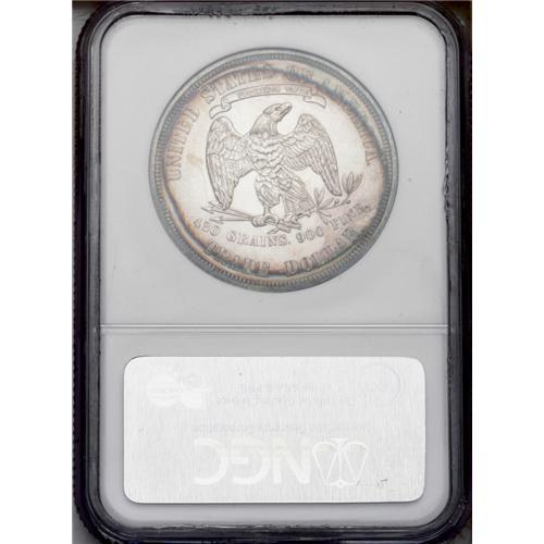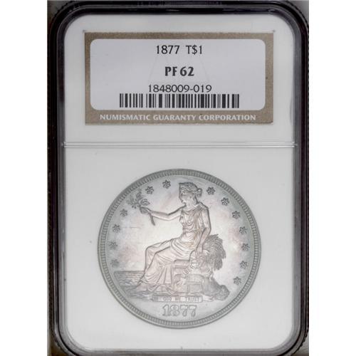 <B>1877<T$1> PR62 NGC.</B></I> This razor-sharp specimen has frosty devices and deeply toned fields, which display plum and forest-green when confronted with light. Faint hairlines emerge beneath the patina. Aside from the prohibitively rare 1884 and 1885, the proof 1877 has the lowest mintage of the type. A scant 510 pieces were struck.