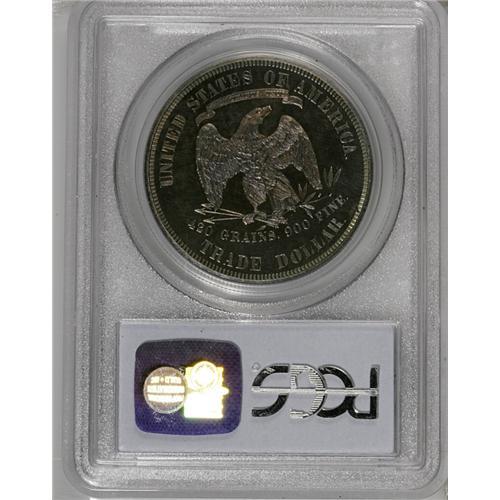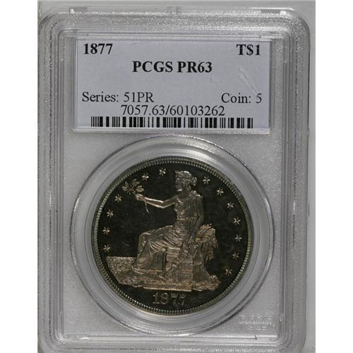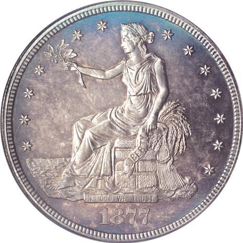 <B>1877<T$1> PR63 PCGS.</B></I> Some deep toning shades of gunmetal-blue and deep rose accentuate the nicely mirrored fields. There are a few minor hairlines and contact marks, the only grade-limiting factors. A Select proof example of a very interesting issue.