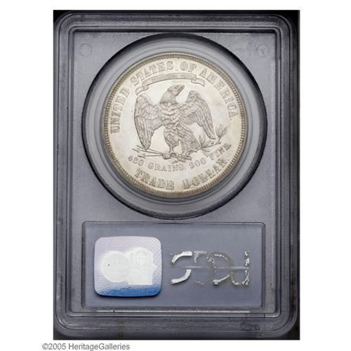 <B>1877<T$1> PR64 Cameo PCGS.</B></I> Although Mint delivery records indicate a production of just 510 Proof Trade Dollars in 1877, it is generally believed today that the actual mintage was 710 coins. According to Mint records, there were 400 Proofs and 200 business strikes produced during the month of February. Then, beginning in March, monthly totals of business strikes ranged from 13,000 coins to 594,000 coins. It seems highly unlikely that the Mint would have set up the presses to coin just 200 business strikes that February. For this reason, most numismatists today believe that those 200 coins were additional Proof examples, resulting in an actual Proof mintage of 710 coins.<BR> This is one of only a few Cameo-designated proof 1877 Trade Dollars that we can recall handling. Unlike most extant specimens (which are fully brilliant in finish), this coin displays pleasing field-to-device contrast with the latter being well frosted and sharply detailed. The otherwise golden iridescence assumes a silver cast through the center of the reverse. Population: 8 in 64 Cameo, 3 finer in Cameo condition (9/05).<BR><I>From The Jack Lee Collection, III</B></I>