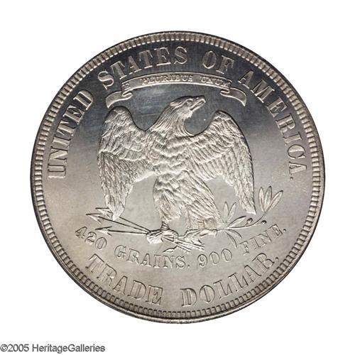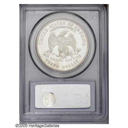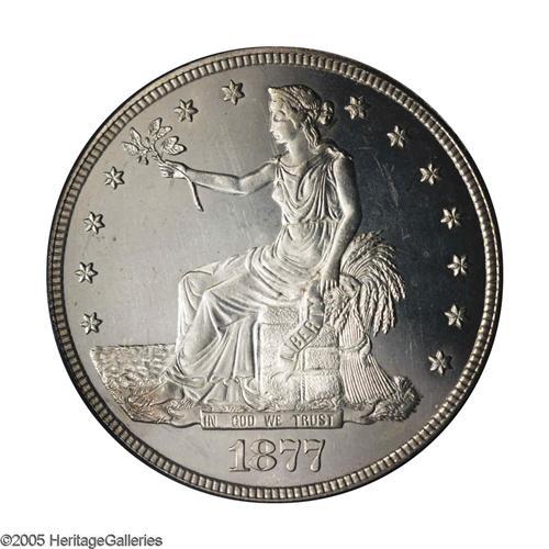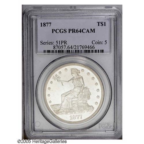 <B>1877<T$1> PR64 Cameo PCGS.</B></I> Except for the ultra-rare 1884 and 1885, the 1877 has the lowest proof mintage in the series with only 510 pieces produced, although it is a figure that some specialists feel is under-reported. Both sides of this well contrasted specimen present an essentially brilliant appearance. Just a few minor scuffs and hairlines are seen in the fragile fields that limit the grade. Identifiable by a thin line just behind and beneath Liberty's head. Population: 8 in 64, 3 finer (12/05).<BR><I>From The Andy Geosits Collection of Trade Dollars.</B></I>