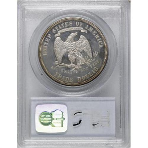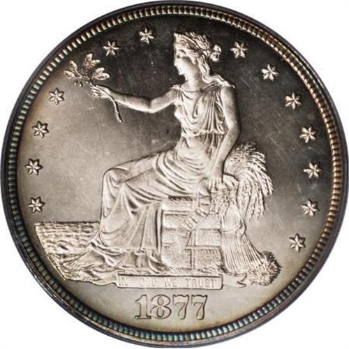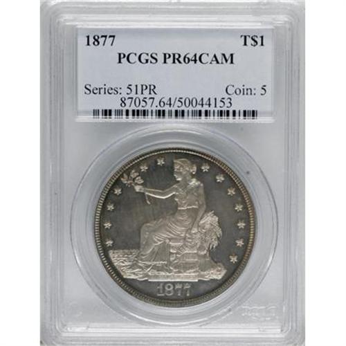 <B>1877 T$1 PR64 Cameo PCGS.</B></I> Light gold toning graces this razor-sharp proof Trade dollar. The proof 1877 has a mintage of just 510 pieces, the lowest of the series except for the prohibitively rare 1884 and 1885. A faint mint-made planchet streak crosses Liberty's extended arm, and the reverse field is slightly cloudy. Population: 10 in 64 Cameo, 4 finer (4/07).<BR><BR><b>Shipping:</b> Coins & Currency (<a target="_blank" href="http://www.heritageauctions.com/common/shipping.php">view shipping information</a>\)