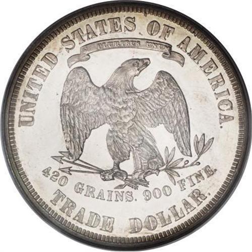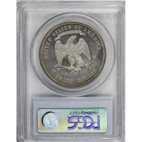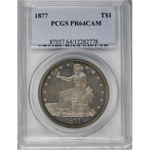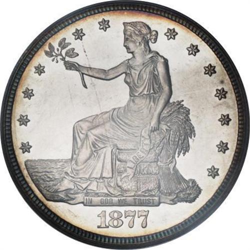 <B>1877 T$1 PR64 Cameo PCGS.</B></I> Both sides of this proof Trade dollar show delicate gold-gray tints over the centers with deeper reddish-orange at the margins. The moderate frost of the devices and the potent mirrors combine for excellent contrast in spite of the coin's patina. With a mintage of just 510 pieces, the 1877 has the lowest mintage of any generally accessible proof Trade dollar issue. Population: 13 in 64 Cameo, 4 finer (12/07).<BR><BR><b>Shipping:</b> Coins & Currency (<a target="_blank" href="http://www.heritageauctions.com/common/shipping.php">view shipping information</a>)