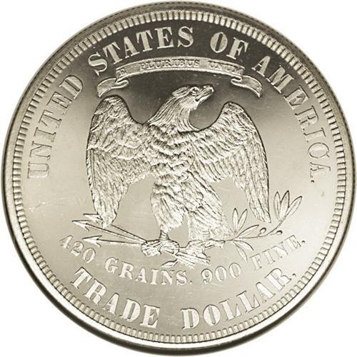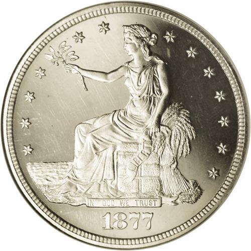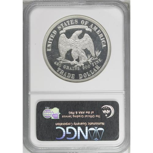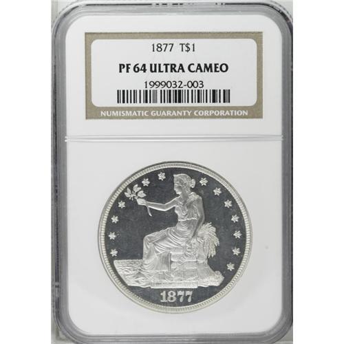 <B>1877<T$1> PR64 Ultra Cameo NGC.</B></I> Breen-5808. Minor repunching on the upper right foot of the 1 and the base of the 8 in the date are diagnostic of this variety. Except for the somewhat controversial 1884 and 1885 issues, the 1877 has the lowest mintage (510 pieces) of any proof delivery in the entire Trade dollar series. This visually enticing specimen leaves no doubt about its noteworthy Cameo status, and indeed it is ensconced in an NGC PR64 Ultra Cameo holder. Untoned surfaces on both sides reveal only a few wispy hairlines and a couple of minor contact marks, and the contrast between fields and devices is especially pronounced. Census: 7 in 64 Ultra Cameo, 2 finer (9/06).