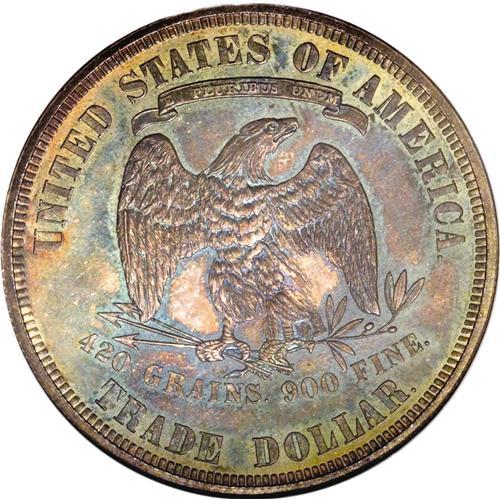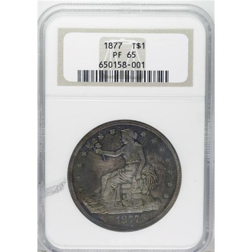 <B>1877 T$1 PR65 NGC.</B></I> Save for the famous 1884 and 1885 specimens, the 1877 issue has the lowest mintage (510 pieces) of any proof delivery in the entire Trade dollar series. The present piece displays smoky steel-blue toning that adequately conceals its reflectivity at most light angles. The pristine preservation of both sides is, however, readily apparent to even the most casual observer. Despite trivial softness of definition on Liberty's head, the strike is razor sharp throughout. An undeniable Gem, this original specimen belongs in the collection of one who admires originality as well as technical quality. Population: 15 in 65, 8 finer (12/06).<BR><BR><b>Shipping:</b> Coin/Currency (<a target="_blank" href="http://www.heritageauctions.com/common/shipping.php">view shipping information</a>)