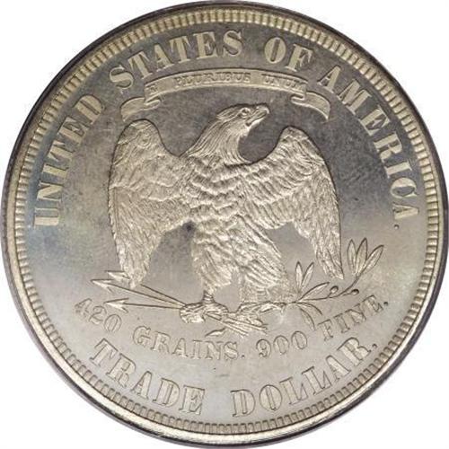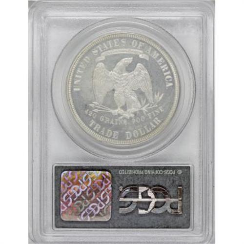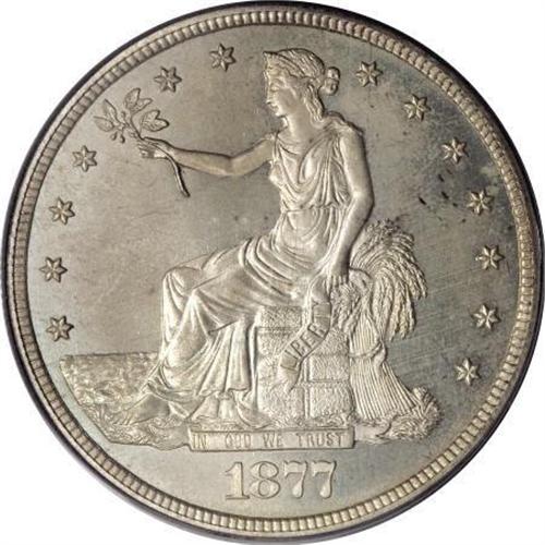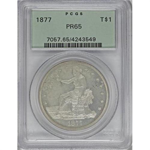 <B>1877 T$1 PR65 PCGS.</B></I> This is a splendid specimen striking with delicate caramel-gold patina. The fields are reflective and the devices are nicely frosted, but no cameo designation is present, perhaps due to its green label holder. Intricately struck, and rare in such high quality. Only 510 proofs were struck of the 1877 proof Trade dollar, the lowest output of proofs other than the 1884 and 1885. Population: 15 in 65, 5 finer (9/07).<BR><I>Ex: Jack Lee Collection, III (Heritage, 11/05), lot 5182.</B></I><BR><BR><B>Coin Engraver:</B> William Barber<BR><BR><b>Shipping:</b> Coins & Currency (<a target="_blank" href="http://www.heritageauctions.com/common/shipping.php">view shipping information</a>)