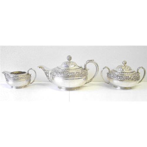 This beautiful antique Tiffany sterling silver coffee set dates from as early 1877, based on the hallmark's "M" in times new roman typeface (in use from 1873 to Edward C. Moore's death in 1891) and the holloware pattern number, 5011, which dates the piece as early as 1877 or early 1888. Included is a coffee pot, sugar bowl and creamer. Each piece features an elaborate floral and organic chased design around the center and acanthus leaves decorate the spouts and handles. Pot measures 9 7/8" long x 6" wide x 5 1/4" high and weighs 1 lbs. 12 oz. Creamer measures 5 3/4" long x 4 1/4" wide x 3 1/8" high and weighs 11 oz. Sugar bowl measures 7 1/2" long x 5 1/4" wide x 4 1/4" and weighs 1 lbs. 4 oz. Each piece is in excellent condition. Each piece is marked: