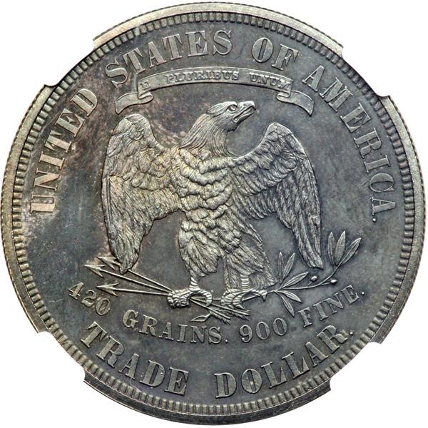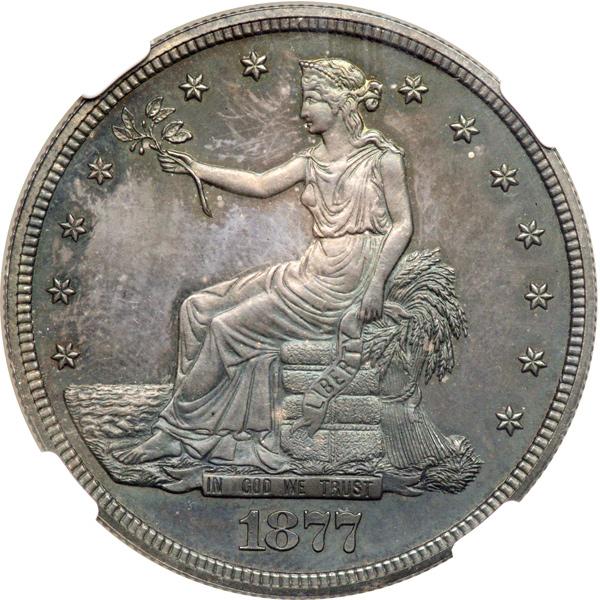 1877 Trade Dollar. NGC graded Proof 64. Only 510 Proofs struck. Even blue and dark green toning on both sides. A hard to believe array of rich antique-gray hues enhance the surfaces of this handsome choice Proof 64 low-mintage Proof Trade dollar. A small region of lighter color is seen at the Liberty's shoulder on the obverse and into the left field. The present prize is quite attractive. Regarding this date, the clearest details are found throughout the peripheral areas and also encompassing the key centers which are crystal clear as noted in gunny sacking that Liberty is seated on, as well as the fine plumage on the eagle. A similar eagle, reduced in size, occurs on the short-lived 1875-78 twenty-cent coinage. There is no shield on its breast as on other 19th century denominations. Pop 58; 23 finer.