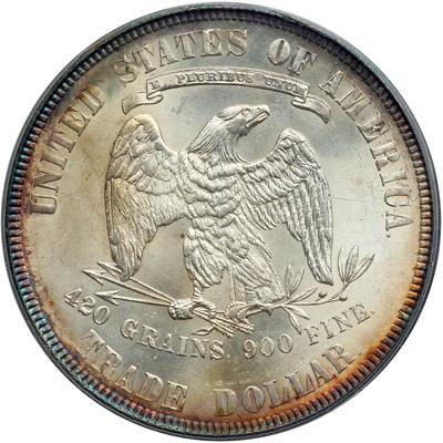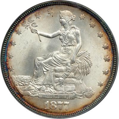 1877 Trade Dollar. PCGS graded MS-64. A trifle soft on the head as struck. The surfaces are quite choice and frosty white with natural dark antique toning about the borders on both sides. Pop 63; 4 in 65 (PCGS # 7044) .