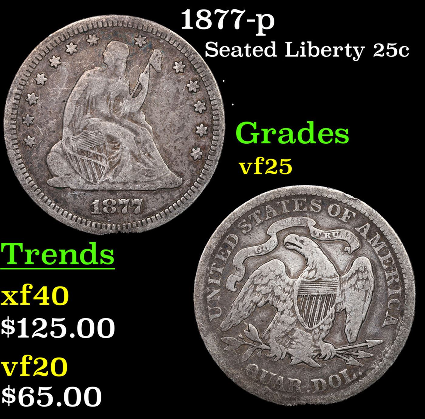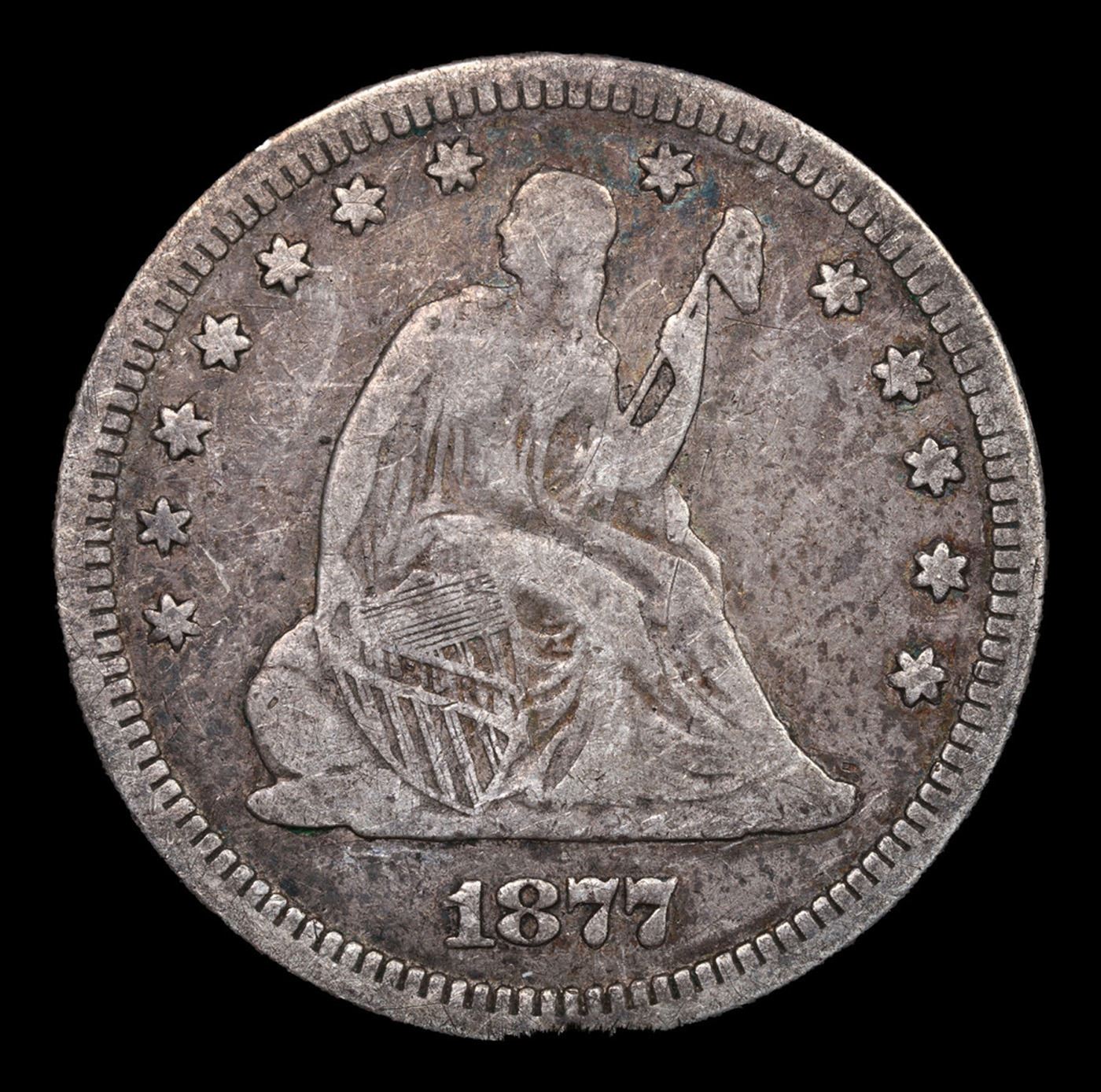 1877-p Seated Liberty Quarter 25c Grades vf+.
