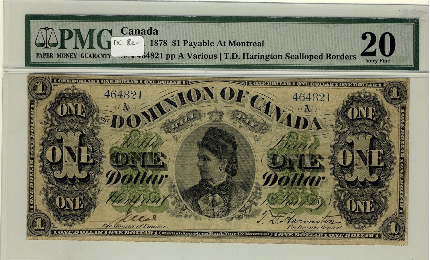 1878, $1 #464821, DC-8e PMG VF20. Designation error on holder, not a scalloped border.