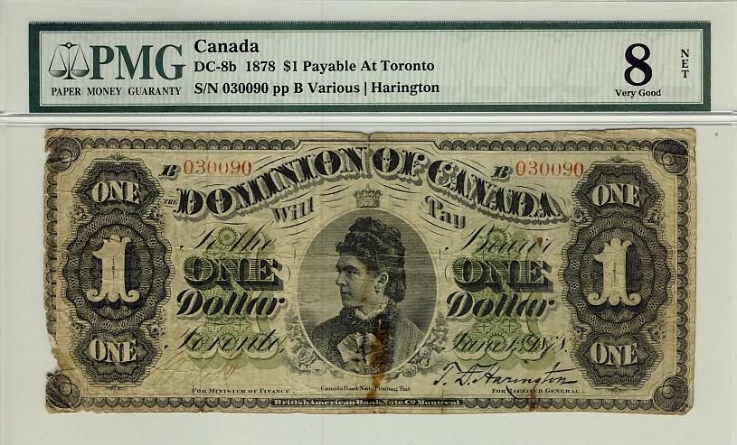 1878 $1 DC-8b #030090, Scallopped borders, Toronto, PMG VG8 Net