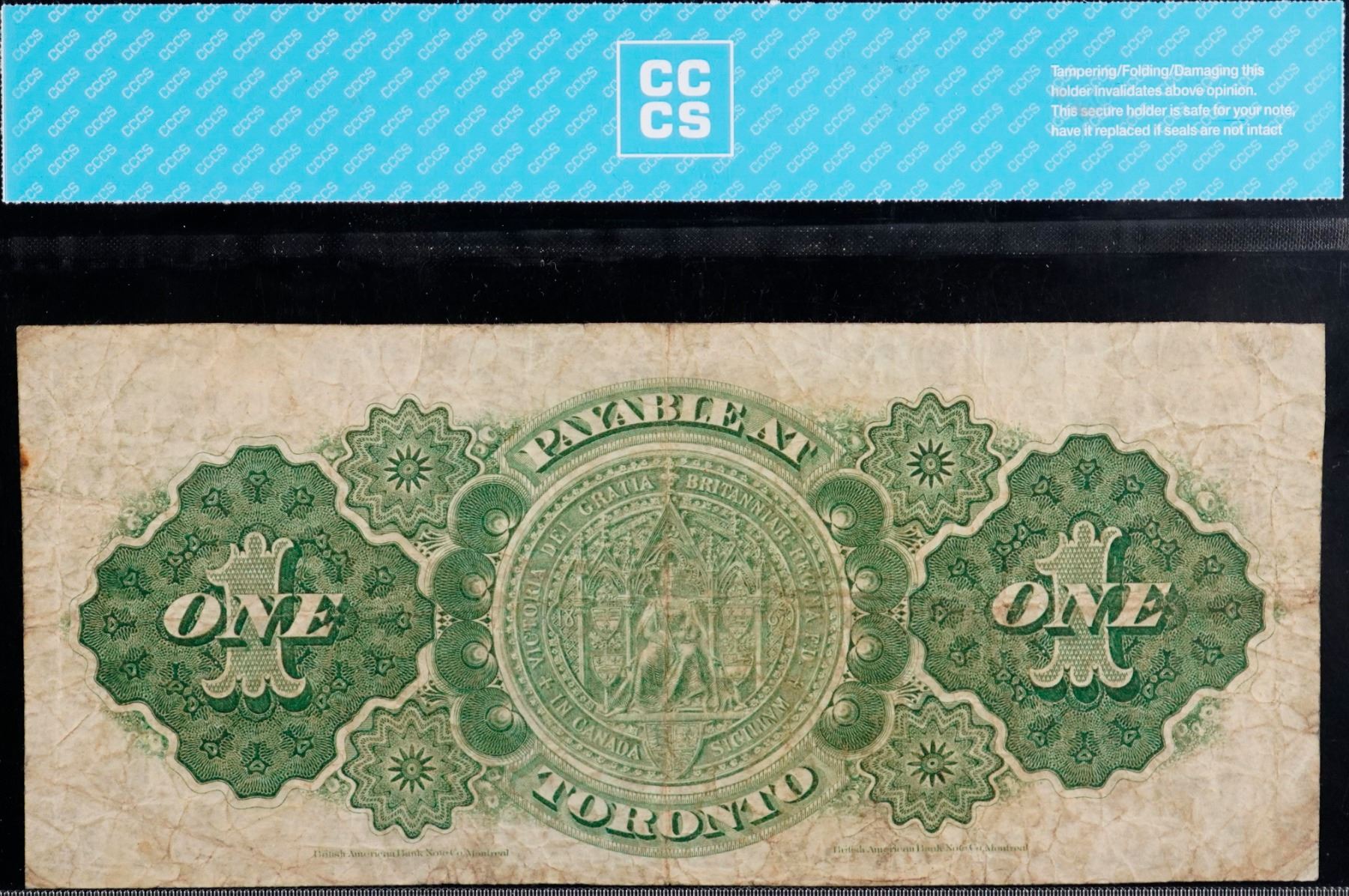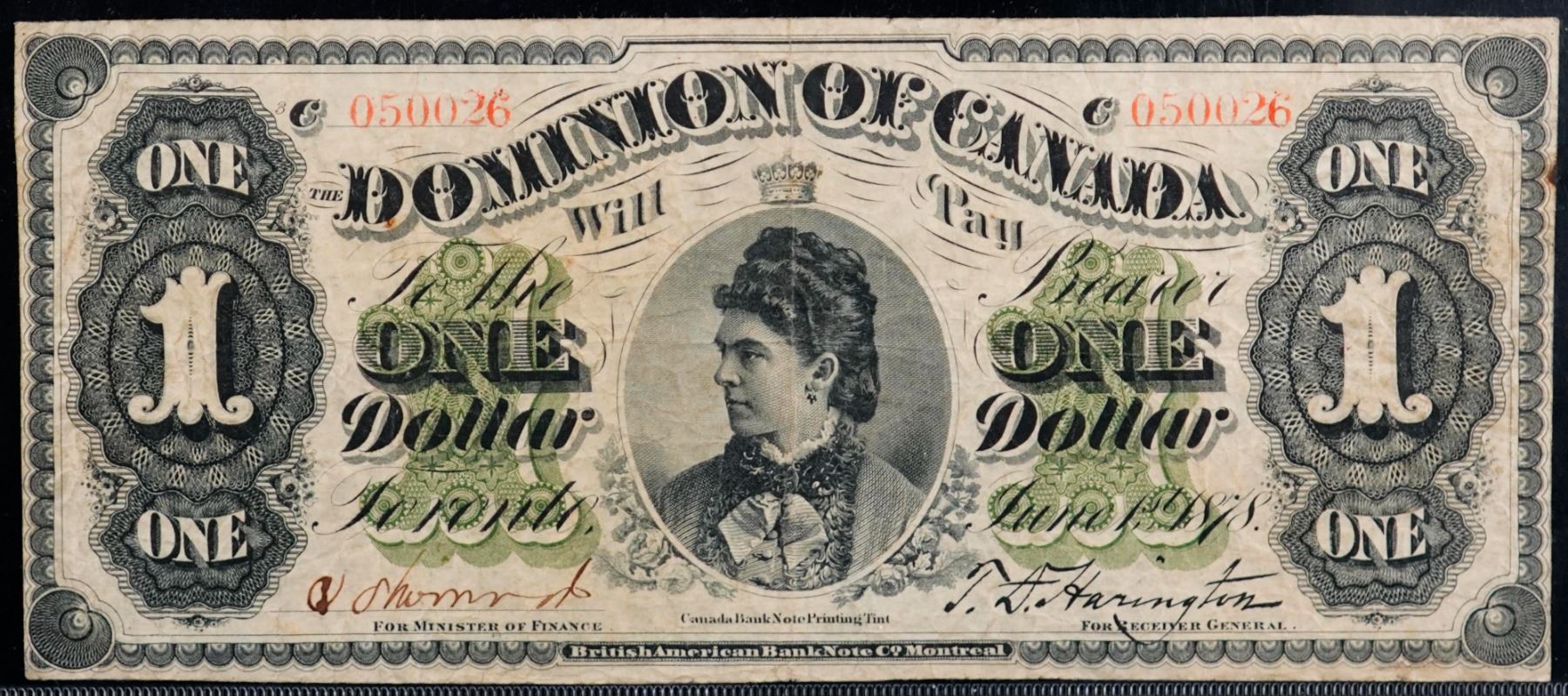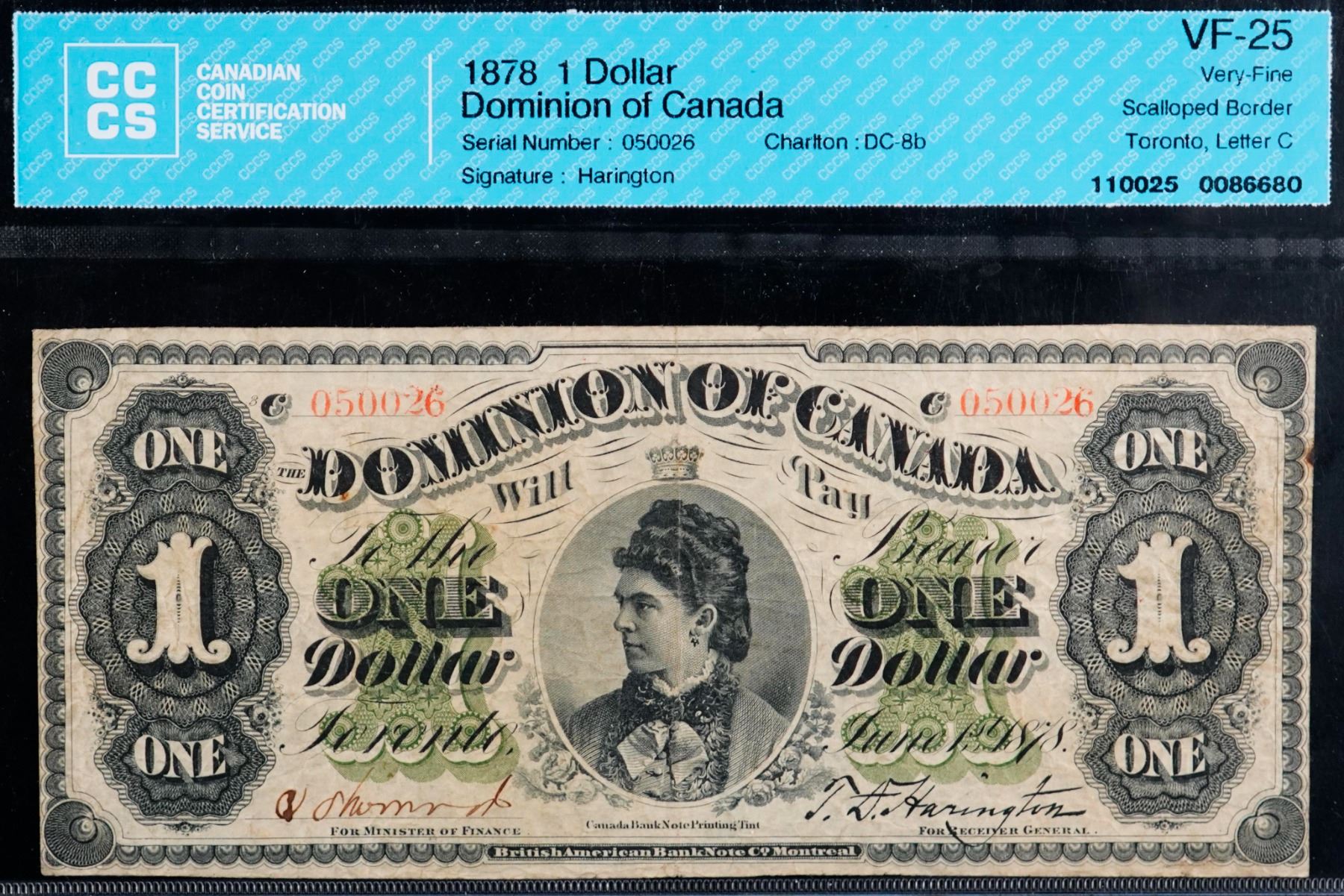 1878 $1 DC-8b #050026 ''Payable at Toronto'' Scalloped borders" CCCS Choice Very Fine-25. Bright with nice colours and quite attractive. Despite all catalogues, worth a premium bid. 2020 RCNA sale saw a similar example bring in $15,275. Rare and seldom offered.