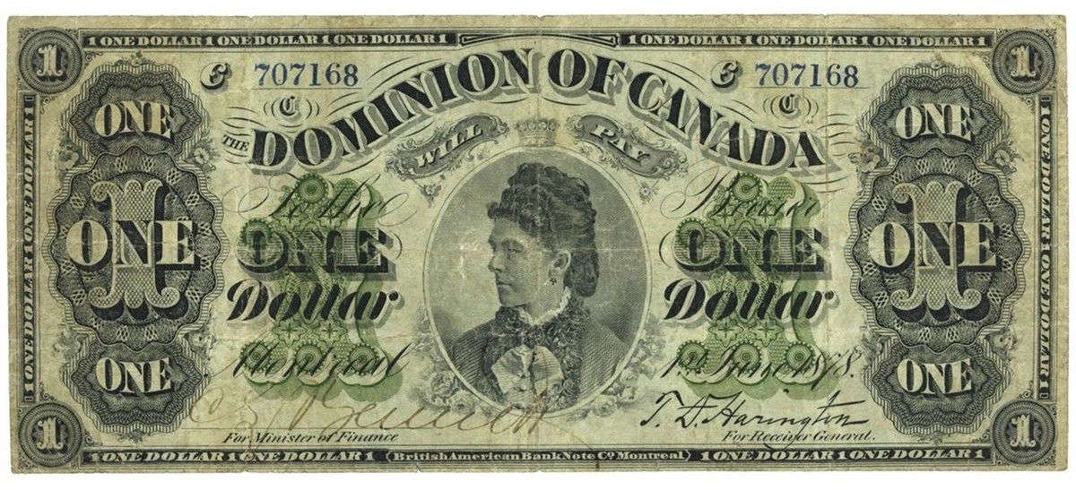1878 $1 DC-8e-iii-O, $1, PMG VF-20, 707168, Payable at Montreal. Bright and lovely example.