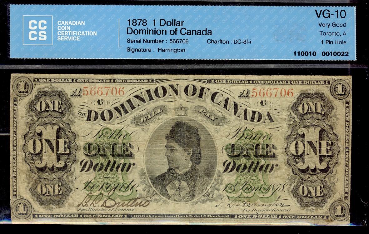 1878 $1 DC-8f-i #A566706 Toronto CCCS VG10. W/ 1 pin hole.