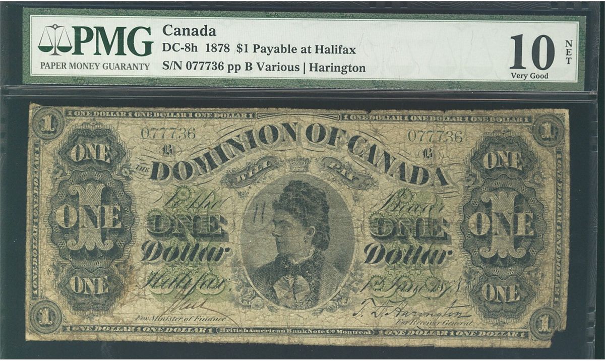 1878 $1 DC-8h #077736 Payable at Halifax PMG VG10 Net. Corner missing. Only 8 known.