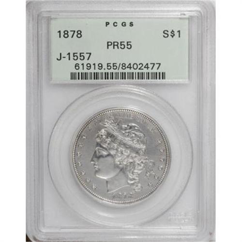 <B>1878 $1 Goloid Dollar, Judd-1557, Pollock-1749, Low R.6, PR55 PCGS.</B></I> William Barber's bust of Liberty faces left. She wears a cap with cereal grains, and her hair is bound with a ribbon. The reverse has a circle of 38 stars along with statutory legends and a description of alloy. Struck in goloid alloy (3.6% gold, 86.4% silver, 10.0% copper) with a reeded edge. No wear is readily evident, but the lightly toned surfaces are faintly hairlined and lack reflectivity. Housed in a green label holder.<BR><BR><b>Shipping:</b> Coins & Currency (<a target="_blank" href="http://www.heritageauctions.com/common/shipping.php">view shipping information</a>)