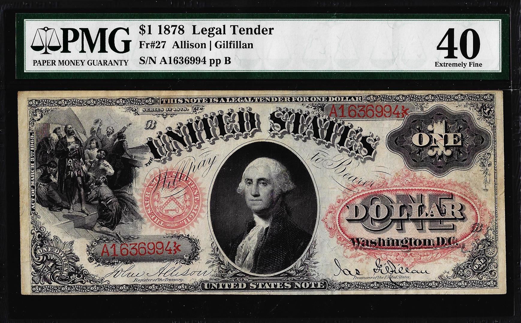 One 1878 $1 Legal Tender Note Fr.27 PMG Extremely Fine 40. PMG Certified.