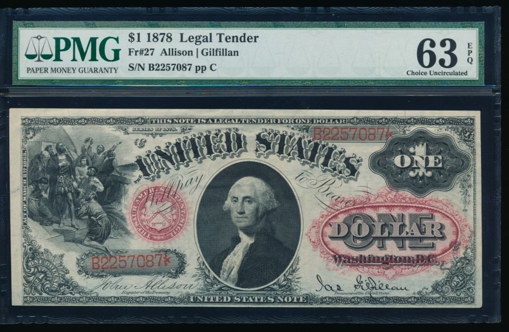 One 1878 $1 Legal Tender Note PMG 63EPQ.