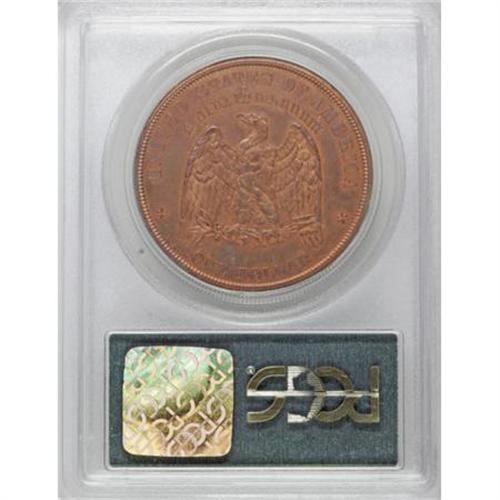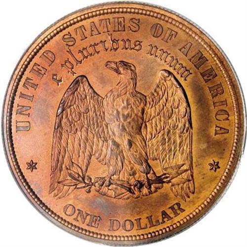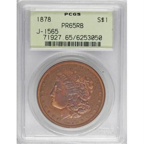 <B>1878 $1 Morgan Dollar, Judd-1565, Pollock-1732, High R.7, PR65 Red and Brown PCGS.</B></I> The obverse is very similar to the issued Morgan dollar, but the 18 in the date is repunched south, and the M initial is raised. The reverse die is that used for Judd-1554. A large eagle stands with raised head and outstretched wings. Both sides have the legend E PLURIBUS UNUM, neither side has IN GOD WE TRUST. Struck in copper with a reeded edge, the only Judd number for this muled die pair. Rich salmon-pink with glimpses of gunmetal-blue. The eagle is well struck, while occasional curls within the portrait lack absolute detail. Unabraded with minimal carbon, and housed in an old green label holder. PCGS and NGC combined have certified only three examples of this extremely rare pattern.<BR><I>Ex: E. Maris Collection; Garrett Collection, Part II (Bowers and Ruddy, 3/80), lot 1053; Jascha Heifetz Collection (Superior, 10/89), lot 3323, which realized $17,050.</B></I><BR><BR><b>Shipping:</b> Coins & Currency (<a target="_blank" href="http://www.heritageauctions.com/common/shipping.php">view shipping information</a>)