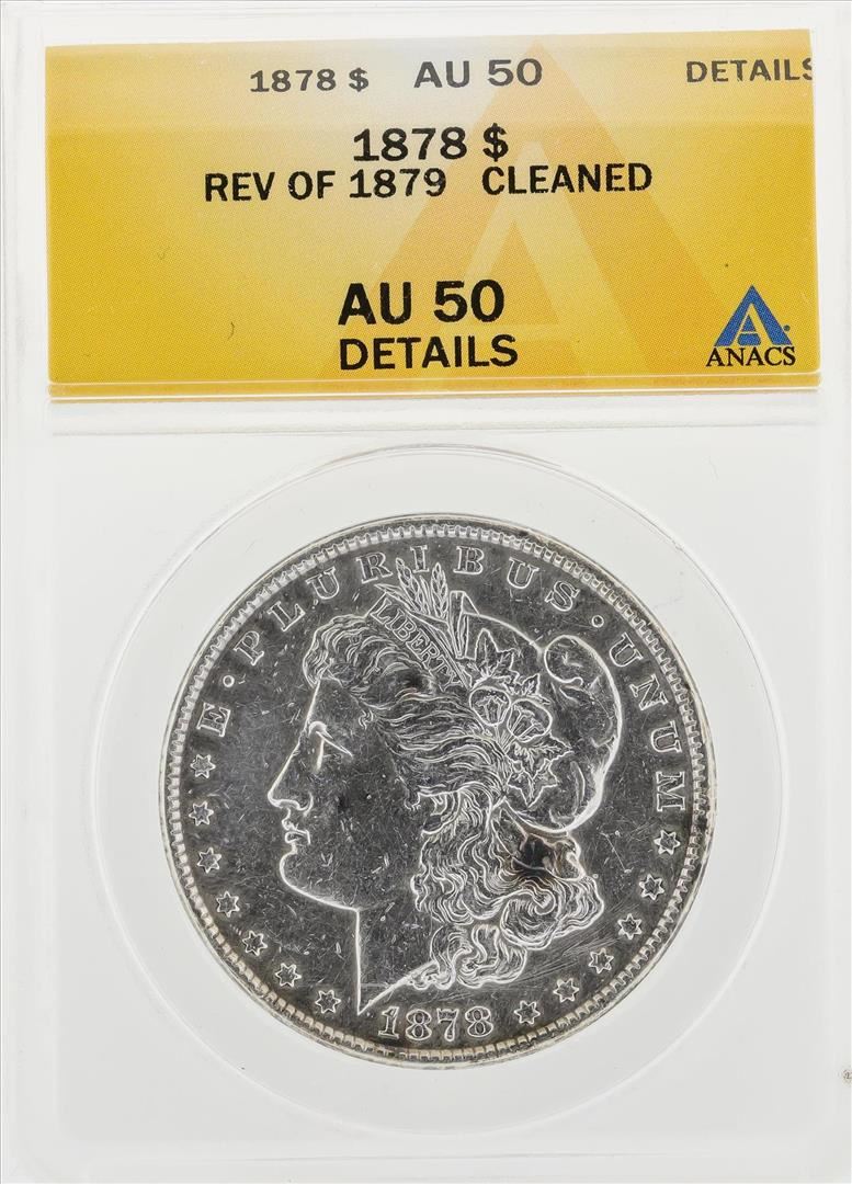 One 1878 $1 Morgan Silver Dollar Coin Rev of 1879 Cleaned ANACS AU50 Details. ANACS Certified.
