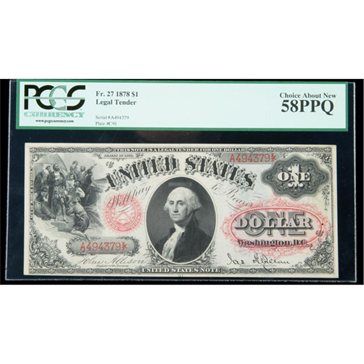 1878, $1 United States Note. PCGS Choice About New 58PPQ. . Fr-27. This is the type of "AU58" that typically sells for more money than a low grade uncirculated example of the same type. It has fantastic colors, bright and original paper, and good margins on both sides. Only the faintest signs of handling kept it from a Choice New grade.
