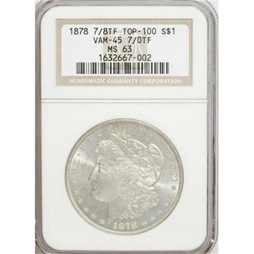 <B>1878 7/8TF $1 MS63 NGC.</B></I> VAM-45. 7/0TF. A Top 100 Variety. NGC Census: (0/0). PCGS Population (10/3). (#133830)<BR><BR><b>Shipping:</b> Coins & Currency (<a target="_blank" href="http://www.heritageauctions.com/common/shipping.php">view shipping information</a>)