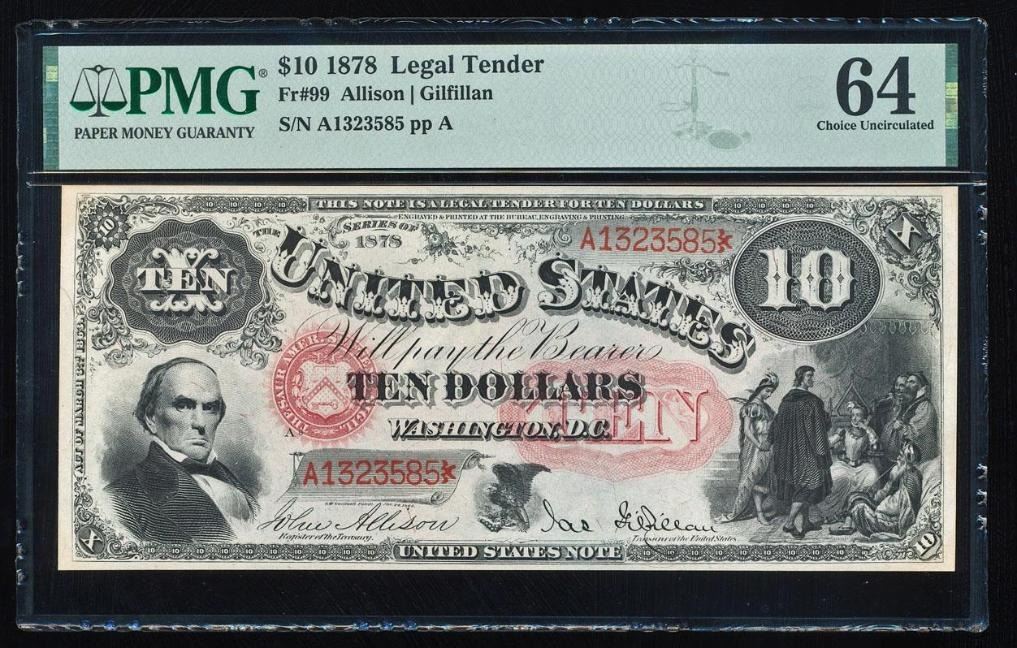 One 1878 $10 Jackass Legal Tender Note PMG 64.