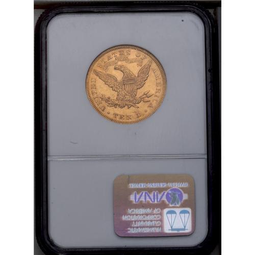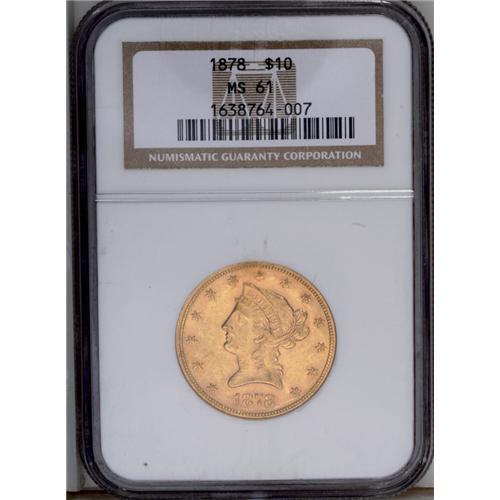 <B>1878<$10> MS61 NGC.</B></I> A well struck and lustrous example of this date, elusive in Mint State. The khaki-gold surfaces have the marks one would expect for the grade, including an abrasion at the base of Liberty's neck. Census: 47 in 61, 41 finer (7/06).