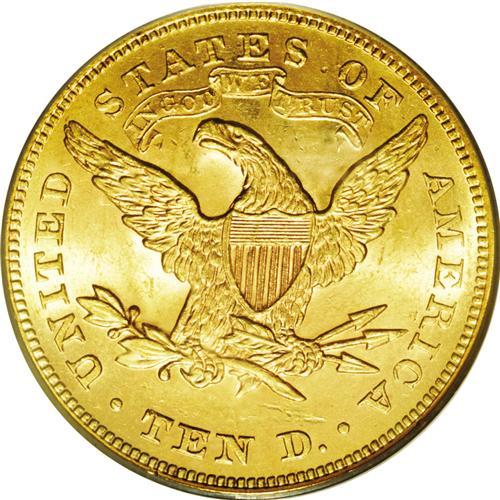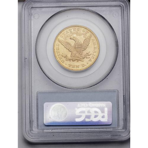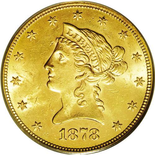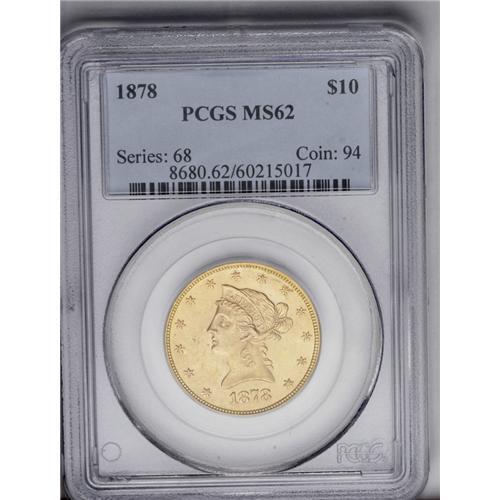 <B>1878<$10> MS62 PCGS.</B></I> The 1878 is a condition rarity among the later issues in the Coronet series, being especially elusive in Mint State. About 200 pieces have been certified in Uncirculated grades by PCGS and NGC combined, and many of these are undoubtedly resubmissions. This example displays bright lustrous surfaces with peach-gold color and sharply struck design elements. Several marks are noted on each side, especially on the obverse, including some shallow scratches in the obverse fields.