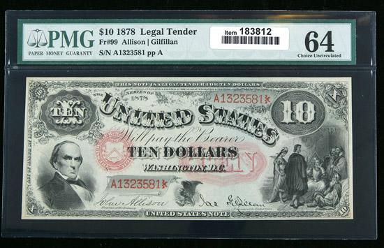1878, $10 United States Note. PMG Choice Uncirculated 64. . Fr-99. A good-looking "Jackass" note from this slightly scarcer design subtype, this piece has good margins and no evident flaws. Truly Gem examples of this Fr. number are in short supply, as out of more than 80 known pieces only six have graded any higher than this example at either of the two major grading services.
