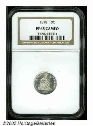 <B>1878<10C> PR65 Cameo NGC.</B></I> Well struck and seemingly free of hairlines or contact marks, this cameo Gem proof is also conditionally scarce. It displays premium quality, with a high degree of technical merit as well as stunning eye appeal. A faint degree of cloudy toning in the obverse and reverse fields is of little importance. Population: 5 in 65 Cameo, 4 finer (6/05).