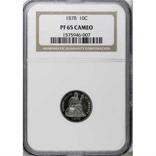 <B>1878 10C PR65 Cameo NGC.</B></I> Powerful mirrors and undeniable contrast are the strongest attributes of this eminently appealing Gem proof. The centers and the moderately frosted devices are essentially untoned, while whispers of gold-orange visit the rims. Census: 6 in 65 Cameo, 3 finer (1/08).<BR><BR><b>Shipping:</b> Coins & Currency (<a target="_blank" href="http://www.heritageauctions.com/common/shipping.php">view shipping information</a>)