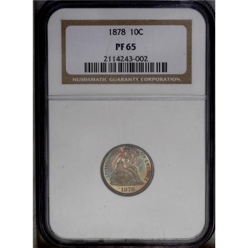 <B>1878<10C> PR65 NGC.</B></I> Only 800 proofs were struck of this date and surprisingly few are known today in Gem condition. This is a lovely, deeply mirrored example whose surfaces are overlaid by rich shadings of sea-green, golden, and rose toning.