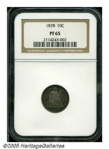 <B>1878<10C> PR65 NGC.</B></I> Only 800 proofs were struck of this date and surprisingly few are known today in Gem condition. This is a lovely, deeply mirrored example whose surfaces are overlaid by rich shadings of sea-green, golden, and rose toning.