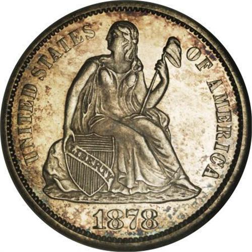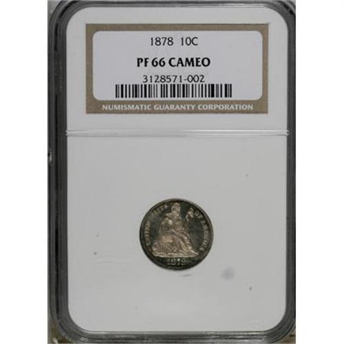 <B>1878 10C PR66 Cameo NGC.</B></I> Type Two Reverse with the E in ONE distant from the wreath. Blushes of cherry-red and ocean-blue embrace the peripheries of this boldly struck Premium Gem. Both major devices are frosty, and contrast with the glittering and unblemished fields. Census: 3 in 66 Cameo, 1 finer (2/08).<BR><BR><b>Shipping:</b> Coins & Currency (<a target="_blank" href="http://www.heritageauctions.com/common/shipping.php">view shipping information</a>)