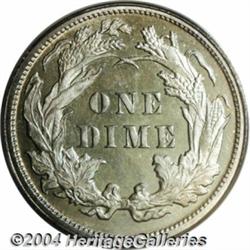 <table><tr><td><table><tr><td>1878 10C PR66 PCGS. Type Two Reverse. Aqua-blue and olive colors appear when this magnificently preserved premium Gem is rotated under a light. A meticulously struck and impressive specimen, one of only 800 pieces struck. Population: 8 in 66, 0 finer (3/04). <BR><BR><B>Important notice:</B> Heritage usually auctions material at the rate of 200-250 lots per hour. On some occasions eBay Live bid software or the Internet may not be able to keep up with the pace of the auction. We recommend placing a realistic absentee bid now as insurance to avoid disappointment. Occasionally the auctioneer may eliminate or reject an eBay Live bid, and the auctioneer may also reopen a lot after the close of the eBay live bidding (usually because we missed an audience bid), and may reject your bid even if it shows you as the winning bidder. By bidding via eBay Live, you agree that Heritage may award the lot to another bidder at its sole discretion under the circumstances described above or any other reasonable circumstances. Since eBay bids are not shown to us until we open the lot on the floor, we treat those bids just like floor bids. In most cases the floor responds before the eBay bid is presented to us, due to Internet lag time, so for consistency we have made it a policy that floor bids are always considered first over tie eBay live bids. Also please note that all Heritage lots purchased through eBay Live carry a 20% Buyer's Premium. Please make sure you read the Terms and Conditions before you bid. <BR><BR><B>IMPORTANT ANNOUNCEMENT ABOUT RESERVES:</B> Heritage now divulges all reserves on its web site 7 days before every auction. If you want to know whether the reserve on this lot has been met, and if not, what the reserve amount is, please visit this lot page on the HeritageCoin.com web site, or email: bid@HeritageGalleries.com </span></font></td></tr></table></td></tr></table>