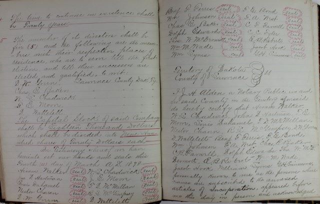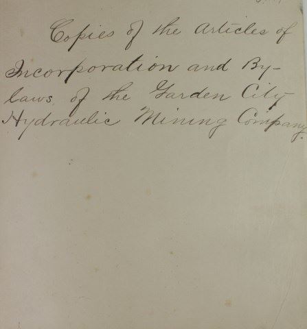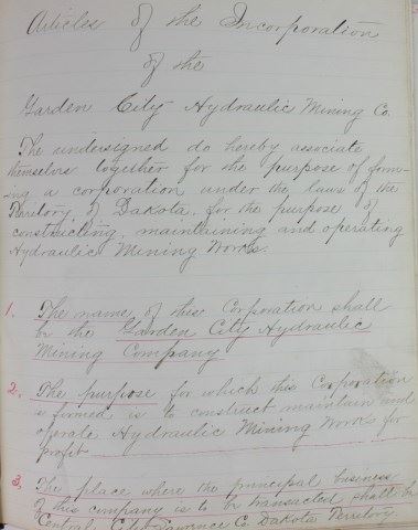 for the Garden City Hydraulic Mining Co. Central City Dakota Territory as drawn up by Henry Frawley. Great piece of Black Hills mining history listing local directors, capital stock value of 18,000 dollars and local share holders, 7" X 8 1/2". Frawley Estate item. Est. 200-400