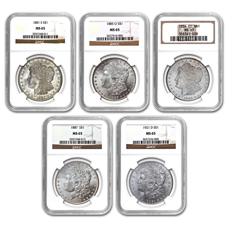 1878-1921 5-Coin Morgan Dollar Mintmark Set MS-65 NGC