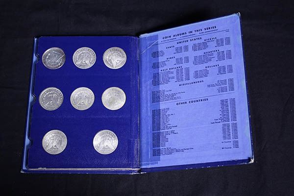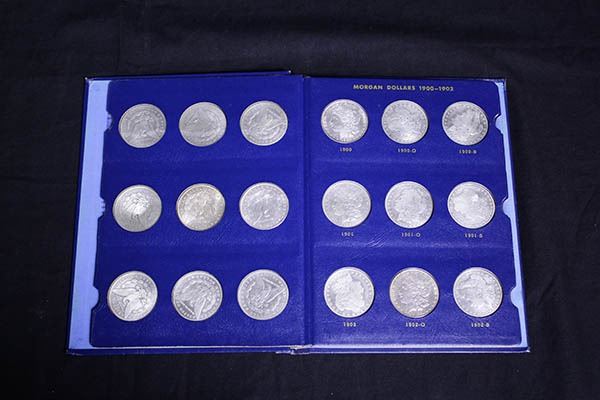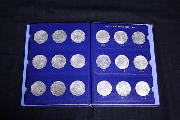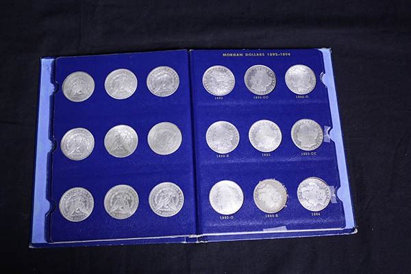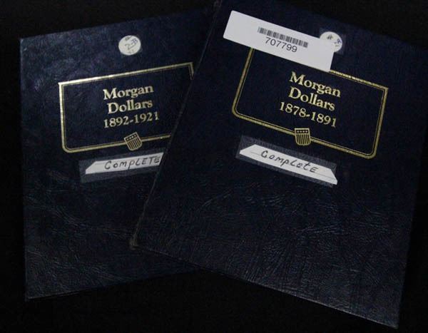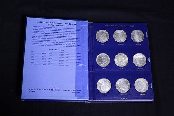1878-1921 Morgan Dollar Type Set, no 1895. Very Good to Very Nice. Housed in the Blue Whitman folder as formed by an old time collector/hoarder in variable to decent quality, painstakingly assembled over many decades, inspection invited. A few with faults as one may expect.