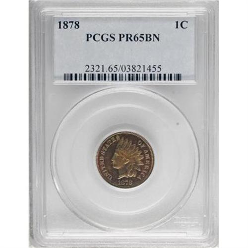 <B>1878 1C PR65 Brown PCGS.</B></I> PCGS Population (5/0). NGC Census: (12/0). Mintage: 2,350. Numismedia Wsl. Price for NGC/PCGS coin in PR65: $320. (#2321)<BR><BR><B>Coin Engraver:</B> James B. Longacre<BR><BR><b>Shipping:</b> Coins & Currency (<a target="_blank" href="http://www.heritageauctions.com/common/shipping.php">view shipping information</a>\)