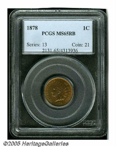 <B>1878<1C> MS65 Red and Brown PCGS.</B></I> Well struck and lustrous, with minor browning and a few flyspecks on each side, but entirely free of contact marks or planchet defects. A faint mark on Liberty's jaw is well concealed by some darker purple-red patina. Population: 56 in 65, 2 finer (3/05).