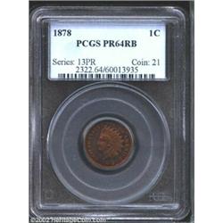 1878 1C PR64 Red and Brown PCGS. Bright orange-gold color, with hints of violet iridescence at the margins. A well struck near-Gem with exquisitely preserved mirrored fields. A splendid representative of this lower mintage date. Important notice: We expect to be auctioning lots at the rate of 200-250 per hour. Sometimes eBay Premier live bid software cannot keep up with that pace, so we strongly recommend that you place a realistic proxy bid now as insurance to avoid disappointment. Also please note that all Heritage/CAA lots purchased through eBay Premier carry a 20% Buyer's Premium. Please make sure you read the Terms and Conditions.