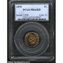 1878 1C PR66 Red PCGS. Beginning in 1878, the Mint made a couple of changes regarding its handling of proof Indian Cent production. For starters, the mintage figures were accurately recorded. Secondly, and perhaps most importantly for today's collectors, the number of coins delivered rose significantly above 1859-1877 levels. While the typical 1878 is more common that most proof Indian Cents from earlier years, this date is still conditionally rare at the Gem Red level of preservation. Gorgeous pinkish-red luster shimmers over both sides of this pleasingly reflective specimen. Neither the smooth surfaces nor the razor sharp devices are worthy of even the slightest criticism. Worthy of a strong bid. Population: 12 in 66 Red, there is just one example finer (1/03). Important notice: We expect to be auctioning lots at the rate of 200-250 per hour. On occasion eBay live bid software cannot keep up with the pace of the auctions where 4-5 lots per minute can hammer down, so we recommend that you place a realistic absentee bid now as insurance to avoid disappointment. Also please note that all Heritage/CAA lots purchased through eBay Live carry a 20% Buyer's Premium. Please make sure you read the Terms and Conditions.