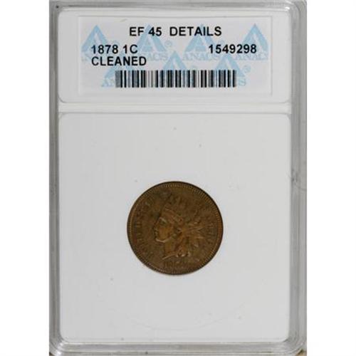 <B>1878 1C --Cleaned--ANACS. XF45 Details.</B></I> NGC Census: (8/141). PCGS Population (13/80). Mintage: 5,799,850. Numismedia Wsl. Price for NGC/PCGS coin in XF45: $170. (#2130)<BR><BR><B>Coin Engraver:</B> James B. Longacre<BR><BR><b>Shipping:</b> Coins & Currency (<a target="_blank" href="http://www.heritageauctions.com/common/shipping.php">view shipping information</a>\)