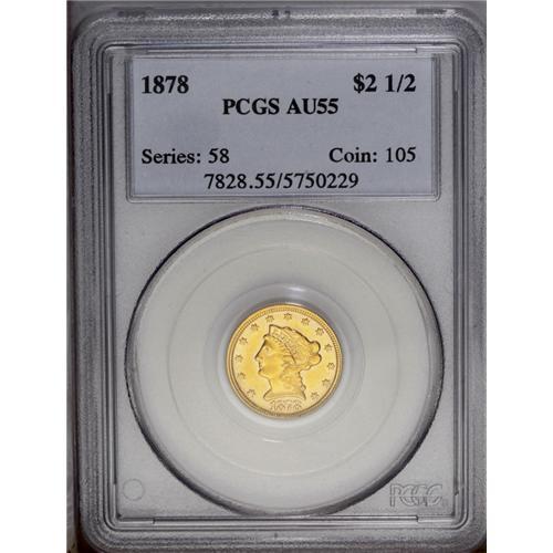 <B>1878 $2 1/2 AU55 PCGS.</B></I> A well struck piece with attractive surfaces and little indication of rub. Bright luster forms a halo near the margins. The rich coloration makes this an exceptionally attractive Choice AU example.