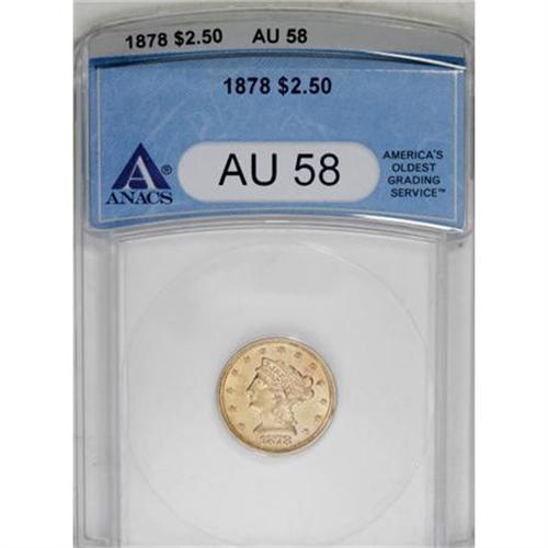 <B>1878 $2 1/2 AU58 ANACS.</B></I> NGC Census: (259/1133). PCGS Population (198/792). Mintage: 286,260. Numismedia Wsl. Price for NGC/PCGS coin in AU58: $210. (#7828)<BR><BR><B>Coin Engraver:</B> Christian Gobrecht<BR><BR><b>Shipping:</b> Coins & Currency (<a target="_blank" href="http://www.heritageauctions.com/common/shipping.php">view shipping information</a>\)