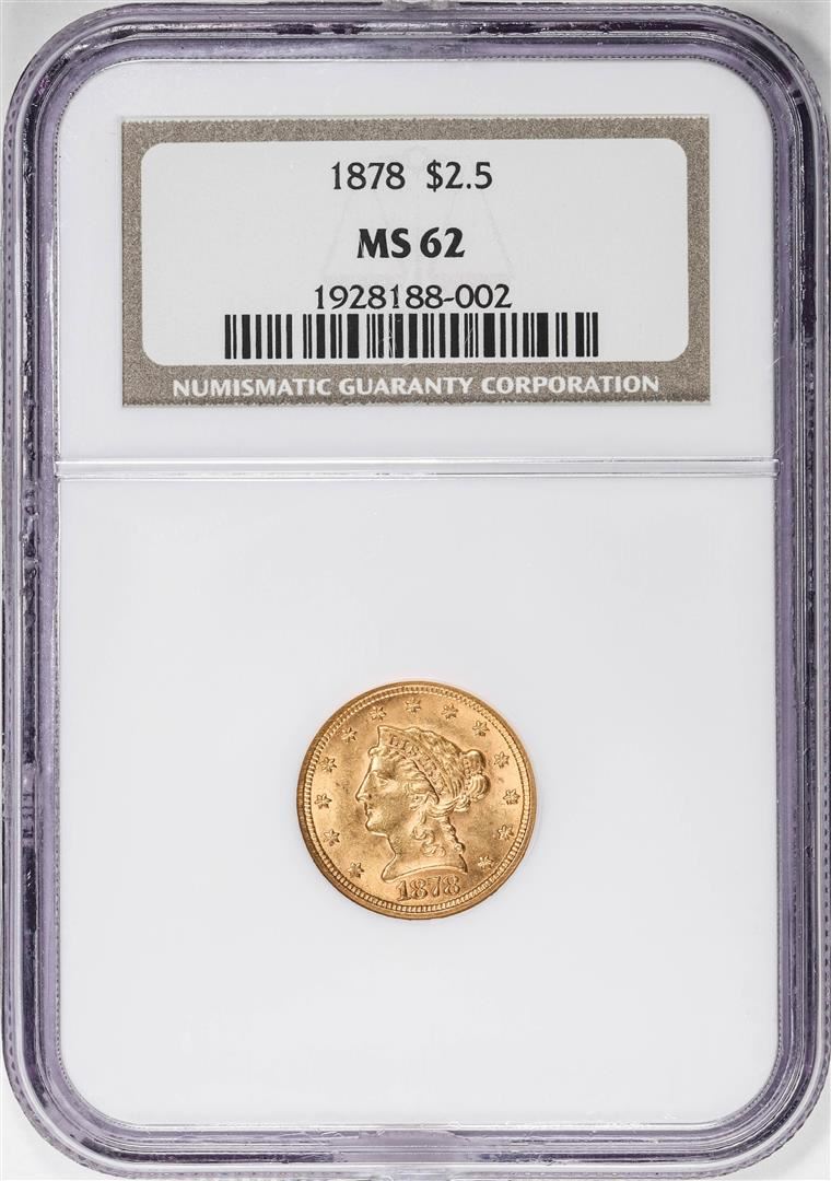 One 1878 $2 1/2 Liberty Head Quarter Eagle Gold Coin NGC MS62. NGC Certified.