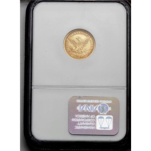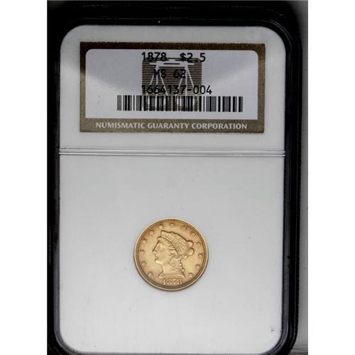 <B>1878<$2 1/2> MS62 NGC.</B></I> Frosty yellow-gold luster with attractive orange peripheral toning. Some central weakness is apparent on both sides.